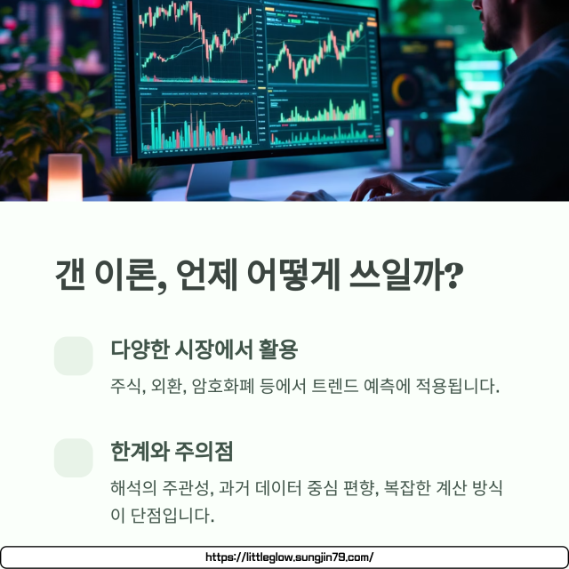 실제 트레이딩에서는 GANN 앵글을 활용해 지지선과 저항선을 파악하고, 시간 예측을 통해 특정 시점에 가격 변동이 일어날 가능성을 예측합니다. 특히, 장기적인 가격 흐름 분석에 효과적이며, 기술적 분석 차트를 풍부하게 해주는 도구로 평가받고 있습니다.
